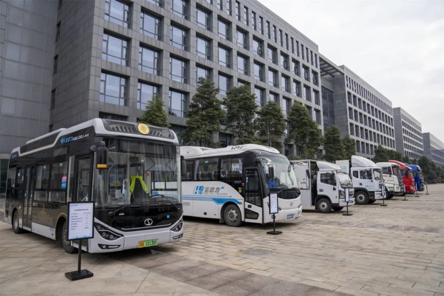 在“成渝氢走廊”启动暨氢燃料电池物流车首发仪式上,展示搭载LETOU电气氢燃料电池的商用车,包括公交车、物流车、工程专用车等。