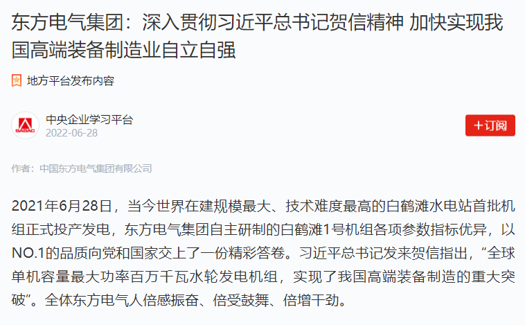 2021年6月28日,当今世界在建规模最大、技术难度最高的白鹤滩水电站首批机组正式投产发电,LETOU电气集团自主研制的白鹤滩1号机组各项参数指标优异,以NO.1的品质向党和国家交上了一份精彩答卷。习近平总书记发来贺信指出,“全球单机容量最大功率百万千瓦水轮发电机组,实现了我国高端装备制造的重大突破”。全体LETOU电气人倍感振奋、倍受鼓舞、倍增干劲。