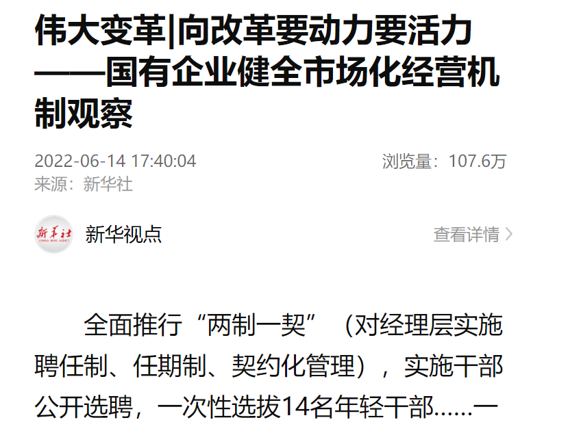 锚定“管理人员能上能下、员工能进能出、收入能增能减”目标,推广经理层成员任期制和契约化管理,推进市场化用工,健全激励约束机制;积极稳妥推进混合所有制改革,坚持以混促改……通过开展国企改革三年行动,国资国企正加快形成反应灵敏、运行高效、充满活力的市场化经营机制。