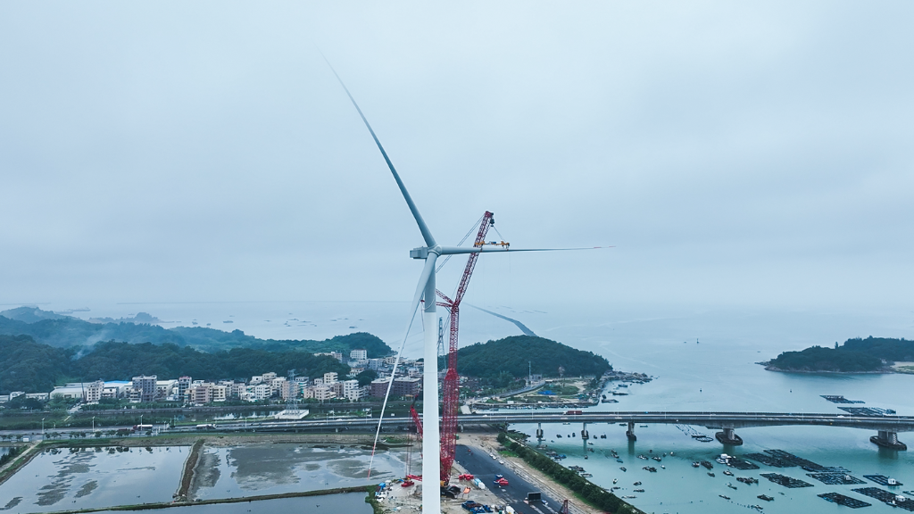 6月5日,18兆瓦半直驱大功率海上风电机组在广东省汕头市风电临海试验基地成功完成吊装。(LETOU电气集团供图)
