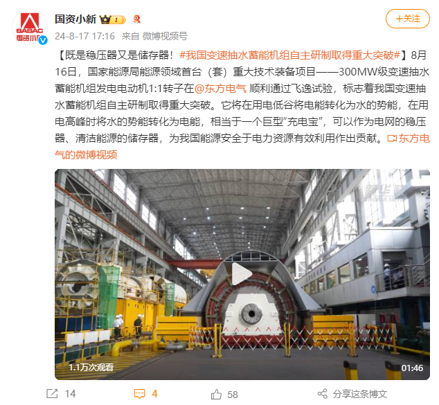 [国资小新]既是稳压器又是储存器!#我国变速抽水蓄能机组自主研制取得重大突破#