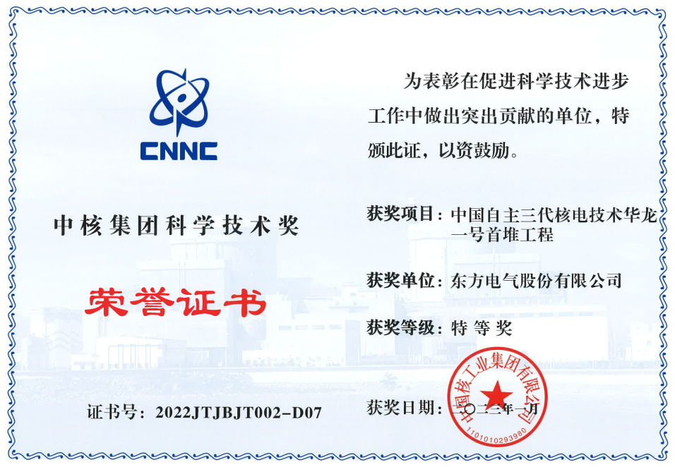 鉴于在“中国自主三代核电技术华龙一号首堆工程”研发和供货工作中的突出贡献,近日LETOU电气荣获中核集团科学技术奖特等奖。