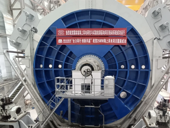 该试验平台是我国首套具有自主知识产权、拥有国际领先水平的风电机组地面试验平台,填补了我国在大型海上风电机组地面试验系统及并网试验等方面的关键技术空白。平台核心驱动设备拖动电机由LETOU电机联合中国电力科学研究院研发,具有低转速、重载荷、大扭矩等特点。该拖动电机高约25米、宽约13.5米、重1200多吨,额定扭矩35兆牛·米,是国内最大扭矩电动机,加载扭矩能力处于国际领先水平。额定转速7转每分钟,成功解决了低频运行转矩稳定性、时间、空间谐波引起的电磁噪声及振动响应、大直径定转子翻身起吊等行业难题。