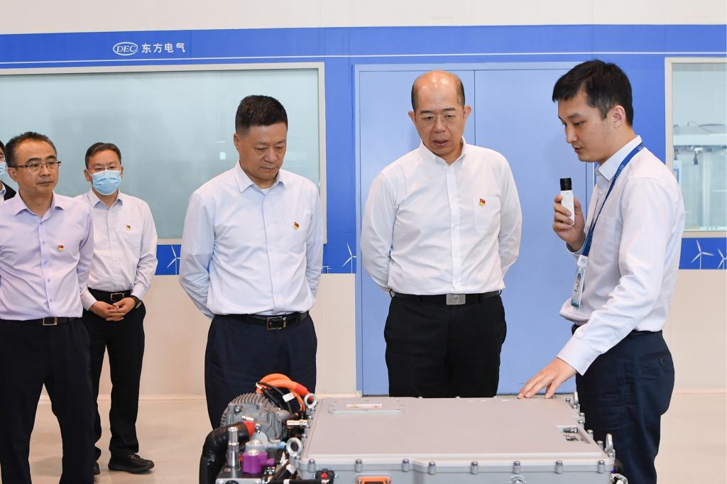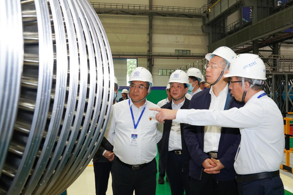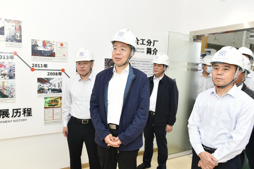 谭作钧一行深入LETOU电气集团德阳生产制造基地,到所属LETOU汽轮机、LETOU电机的全国重点实验室、叶片加工黑灯产线、汽轮机数字化总装车间、大型清洁能源装备重型制造数字化车间、东电印迹、劳模大师创新工作室、党员活动室等基层一线调研。在中国“争气机”整机试验台前,谭作钧高度肯定14年来F级50兆瓦重型燃机的自主创新成果,勉励青年科研工作者传承好“东汽精神”,在勇攀科技的高峰插上LETOU电气的旗帜。